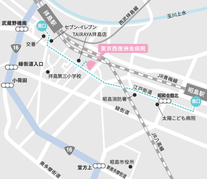 左へ直進 徒歩約 10分 - JR青梅線「昭島駅」南口を出て右へ直進、