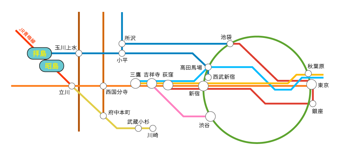 JR青梅線/JR五日市線/JR八高線/西武拝島線の4線が乗り入れ、