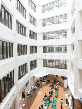 地上から8階まで吹き抜けが広がる開放的な構造が特徴で、動線もスムーズ。働きやすさを重視した環境は、ドラマや映画のロケ地としても注目されています。また、最新の医療機器の導入や多職種との連携体制も整っており、患者さんのために自然と協力し合える風土が根付いています。