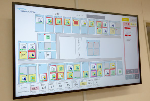 スマートベッドシステムが活躍!患者さまのさまざまな情報は、ベッドサイド端末に表示されます。バイタルの自動入力に加え、眠りスキャンや離床センサーの情報もピクトグラムで可視化されており、一目で状況を把握できます。